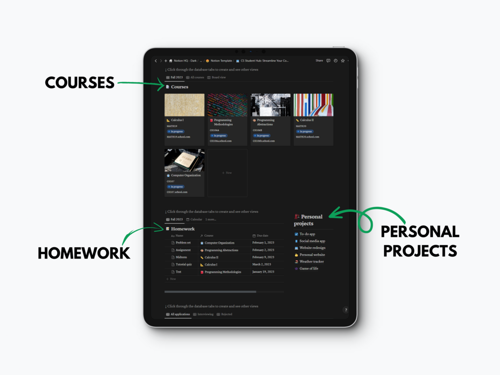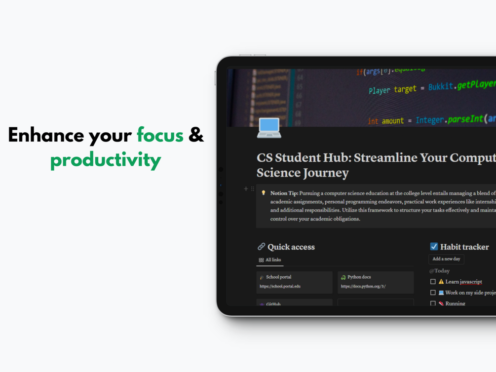 Are you a computer science student striving to balance the demands of coursework, personal projects, internships, and daily life? Look no further! Our meticulously crafted Notion template is here to revolutionize your university experience and empower you to thrive in your computer science journey. Dive into a new realm of efficiency and organization as you unlock the full potential of your academic and personal pursuits.